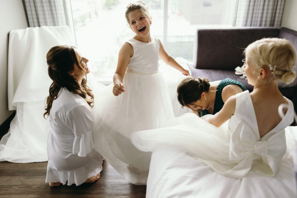Help the little ones feel included by bringing them into moments throughout the day when it feels natural. Let the flower girls pop in during the getting-ready moments, or have the ring bearers hang out with the guys. Not only does this help them feel important, but it also creates the sweetest candid photos.